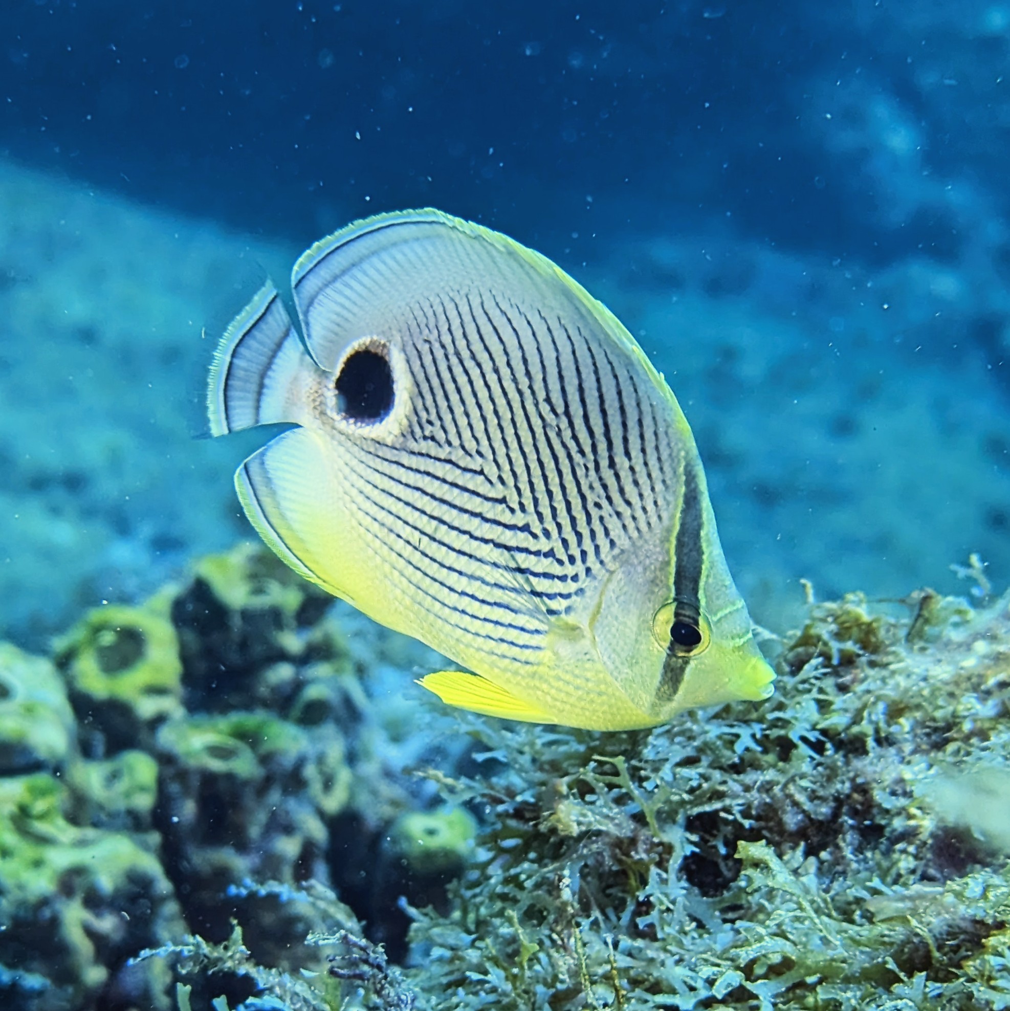 Le poisson-papillon kat zié est un petit poisson marin typique des Caraïbes et des récifs coralliens tropicaux. Il doit son surnom de “quatre yeux” à la grosse tache ronde noire cerclée de blanc qu’il porte de chaque côté de son corps, près de la queue. Ces taches ressemblent à des yeux et servent à tromper les prédateurs, qui attaquent alors l’arrière au lieu de la tête.